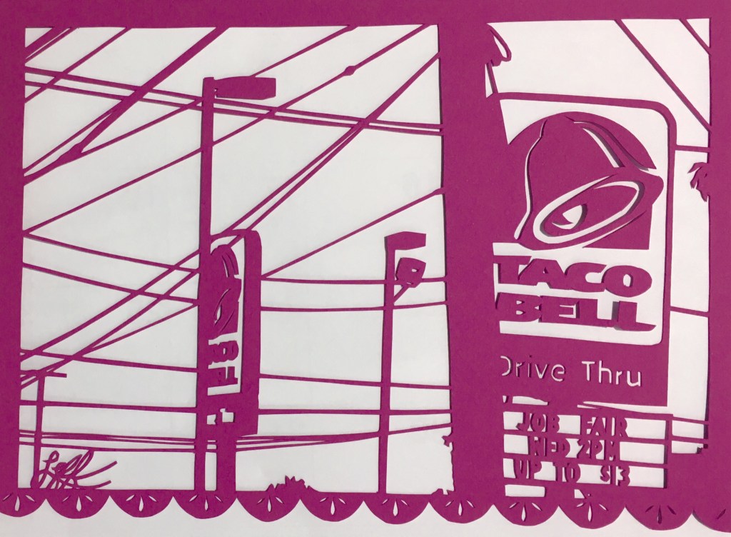 Between painting alongside her grandmother and watching her father build reproduction antique furniture, Rosa Leff grew up seeing no distinction between fine art and craft. What mattered was that things were made by hand and done well. It is with that in mind that she creates her hand cut paper pieces. Each of Leff’s papercuts is cut by hand from a single sheet of paper using a knife. Her cityscapes are based on photos she’s taken in her neighborhood and all over the world. While Leff is best known for her ability to capture thin tangles of powerlines and intricate brickwork, she also enjoys experimenting with novel media such as paper plates and paper towels. Leff delights in bringing a modern, urban perspective to a traditional folk medium.