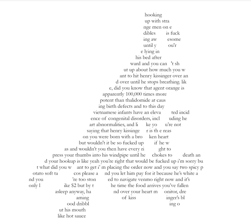 hooking up with strange men on edibles is fucking awesome until you’re lying in his bed afterward and you can’t shut up about how much you want to hit henry kissinger over and over until he stops breathing. like, did you know that agent orange is apparently 100,000 times more potent than thalidomide at causing birth defects and to this day vietnamese infants have an elevated incidence of congenital disorders, including heart abnormalities, and like you’re not saying that henry kissinger is the reason you were born with a broken heart but wouldn’t it be so fucked up if he was and wouldn’t you then have every right to press your thumbs into his windpipe until he chokes to death and your hookup is like yeah you’re right that would be fucked up i’m sorry but what did you want to get i’m placing the order now and you say two spicy potato soft tacos please and you let him pay for it because he’s white and you’re too stoned to navigate venmo right now and it’s only like $2 but by the time the food arrives you’ve fallen asleep anyway, hand over your heart monitor, dreaming of kissinger’s blood dribbling out his mouth like hot sauce