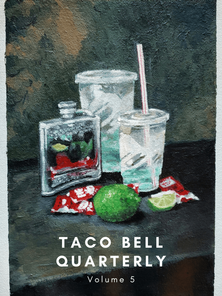 With her long standing love affair of mixing baja blast with any alcohol, an obsession with limes, and her opinion that the best before-during-after drinking food being something from taco bell doused in fire sauce, this painting summed up her personality and memories of friends. She is happy this painting continues to give her and her friends a good laugh, and hopes others have a similar connection to the painting.